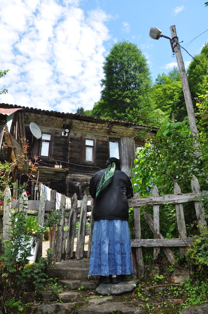Bu fotoğrafta, bir bahçe kapısında, ev sahibinin dışarı çıkmasını bekleyen bir kadın var. Bu bekleyişlerin bir kısmı nafile bekleyiş; köydeki evlerin çoğu boş. Aileler ya İstanbul’a, ya da yurtdışına çalışmaya gitmiş. Geride zihni sağlam, bedeni nemden romatizmalanmış yaşlıları bırakmışlar, uzak tepelere bakarak kızlarını, oğullarını, gözlerinde tüten torunlarını özlemeleri için. Göç vermek Doğu Karadeniz’in kaderi olmuş; sanki yeni nesil dimdik tepelerde köklerini toprağa salamayan genç ağaçlar gibi bu dik yamaçlardan aşağı paldır küldür savrulmuş da geriye en yaşlı, en ulu ağaçlar kalmış, mavi gözlerini gözlerinize dikip “Buraları sahipsiz değil” diyor; size çocuklarının ne iş yaptığını anlatarak aslında ayaklarının altındaki toprağın hafızasına aile bağlarını nakış nakış işliyor. Bu nakışlar birleşip ortak bir kültür oluyor sonra, bu kültürden bir Kazım Koyuncu çıkıyor “Şarkılar bir çığlığa sığınmaksa şimdi/Sonsuz bir yangın gibi/Sevmesem öyle kolay çekip gitmek/Yaralı bir kuş gibi ” diyor, diyor demesine ama işte bu yeşil cennetin tuğba’ları benim doğduğum sene zehirlenmiş, kimbilir belki de o zehir, o sesi aramızdan çekip alıyor. Bu arada şehre gelen bazı Karadenizli müteahhitler ise, -çok görmüş oldukları için değersiz mi buluyorlar acaba?- açlıkla yeşile saldırıp yerine beton döküyor, düz alan buluvermişken insanları kat kat dikey yerleştirecek fizibilite çalışması yapıyor, arkalarına bir çeşit rüzgarı alarak zengin oluyorlar. O rüzgar Karadeniz’den esen rüzgara, paralarının yeşili ninelerinin bekçi dikildiği ağacın yeşiline hiç mi hiç benzemiyor. Geride, aç gözlülüğün uğramadığı bu topraklarda bomboş bahçeye bakıveren Hanife Abla ve benim kadrajım, kalakalıyoruz.